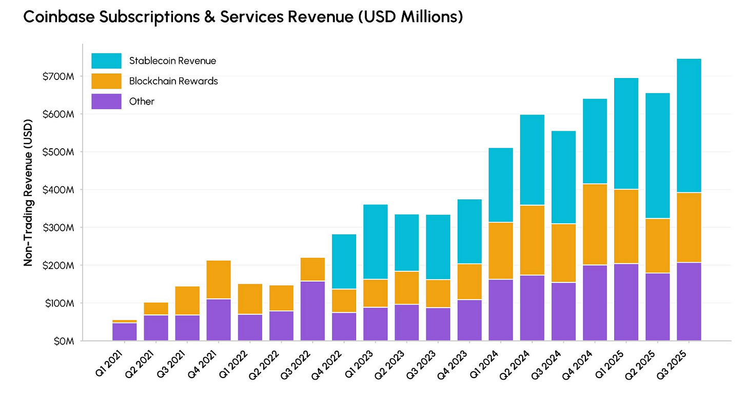 As corretoras e fintechs estão convergindo a partir de diferentes pontos de partida para criar “superaplicativos” cripto completos. A Coinbase exemplifica essa mudança, com a receita de assinaturas e serviços crescendo mais de 7 vezes desde 2021, à medida que se expande para além da negociação, oferecendo juros em stablecoins, recompensas de staking, receitas de Base L2 e produtos financeiros tokenizados. Movimentos semelhantes da Robinhood e da Kraken em direção a ações tokenizadas, mercados de previsão e DeFi integrado destacam a verticalização dos modelos de negócios cripto.