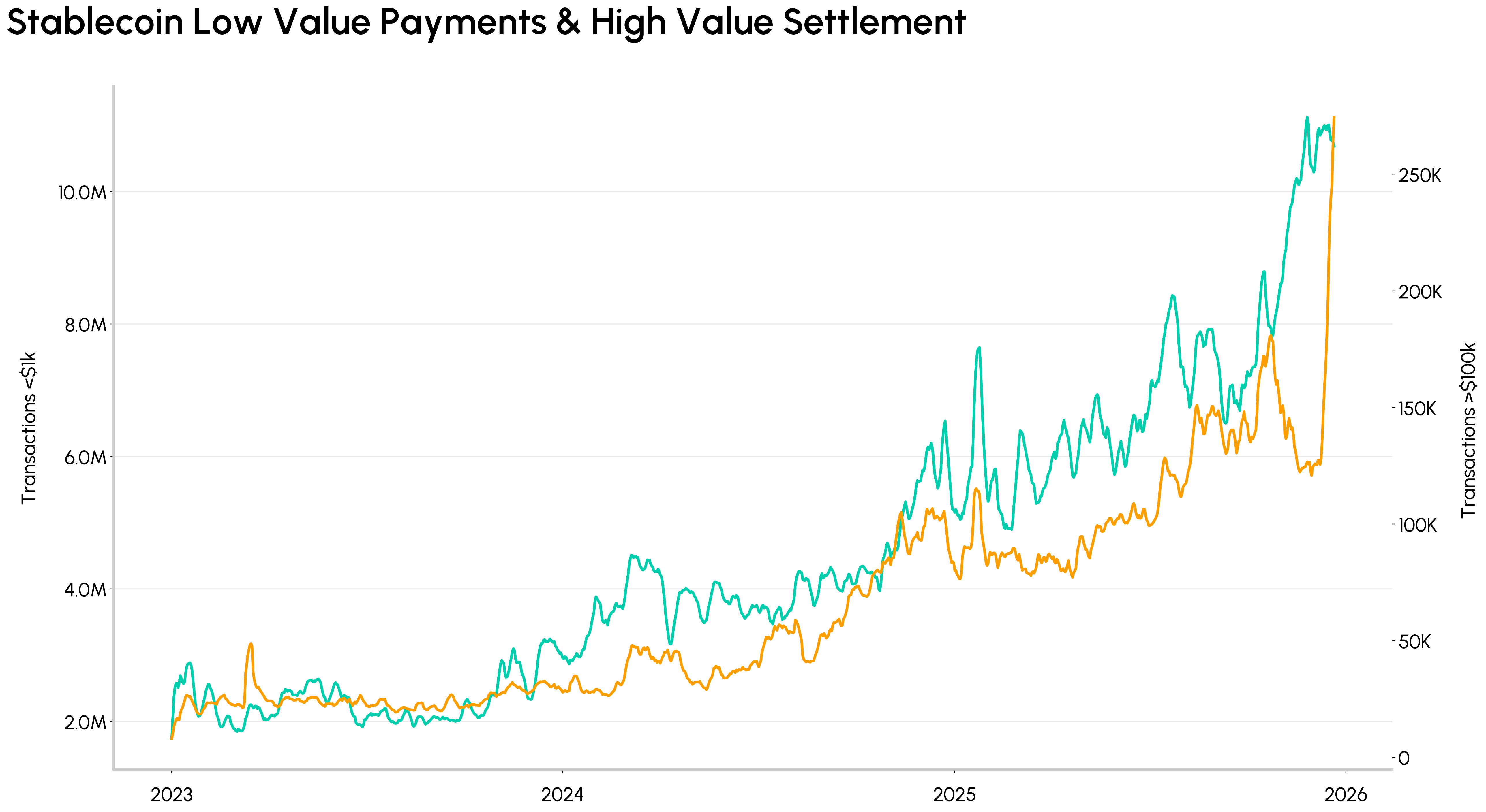 Os custos de transação estão caindo para níveis abaixo de um centavo nas principais blockchains, desbloqueando uma nova escala de adoção. Transferências de stablecoins de baixo valor, abaixo de US$ 1.000, triplicaram em relação ao ano anterior, ultrapassando 10 milhões de transações, enquanto a liquidação de transações de alto valor ultrapassou 250 mil. À medida que a integração com as redes tradicionais se aprofunda, é provável que as stablecoins se expandam ainda mais para remessas internacionais, pagamentos de consumo e B2B, micropagamentos e produtos de poupança. As stablecoins estão se consolidando como a base da próxima fase da atividade econômica on-chain.