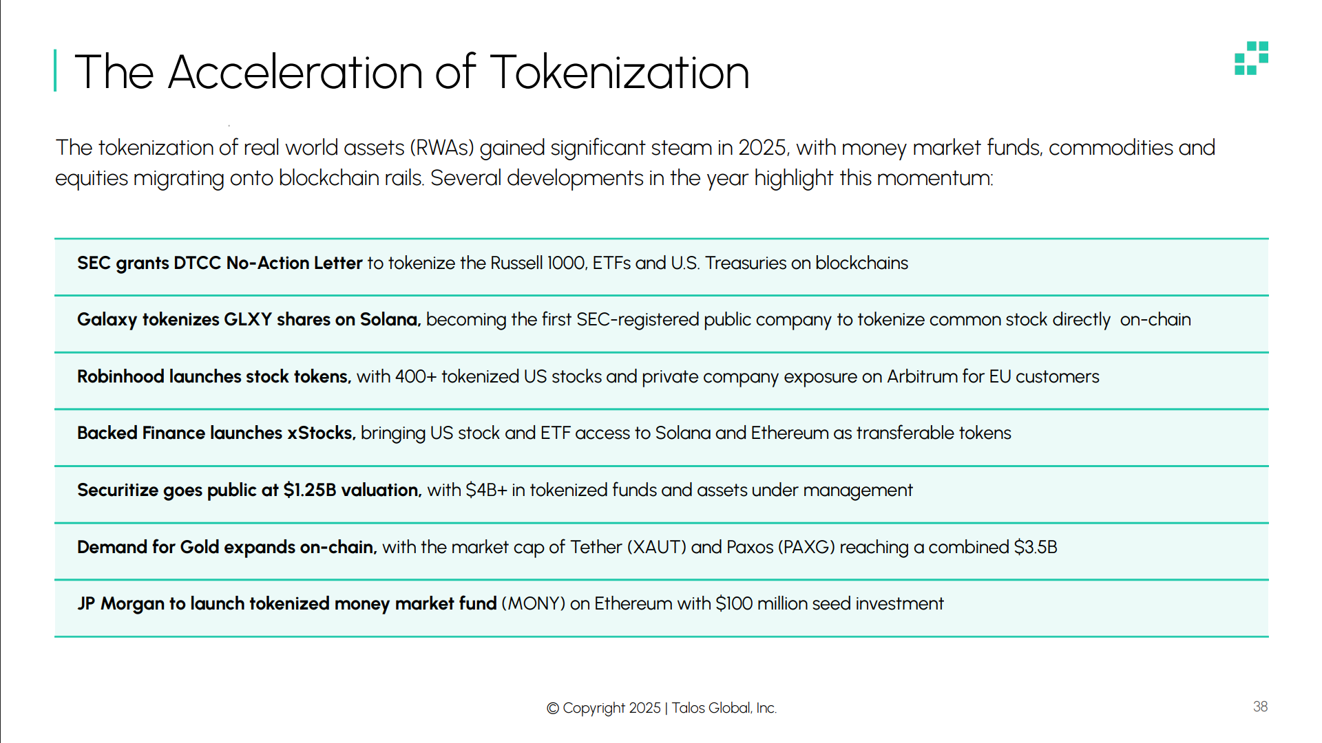 A tokenização de ativos do mundo real está passando da fase experimental para a produção. A DTCC recebeu autorização da SEC para tokenizar o índice Russell 1000, ETFs e títulos do Tesouro em blockchains públicas. A Galaxy tokenizou ações na Solana, enquanto a Robinhood e a Backed Finance trouxeram mais de 400 ações americanas para a blockchain.