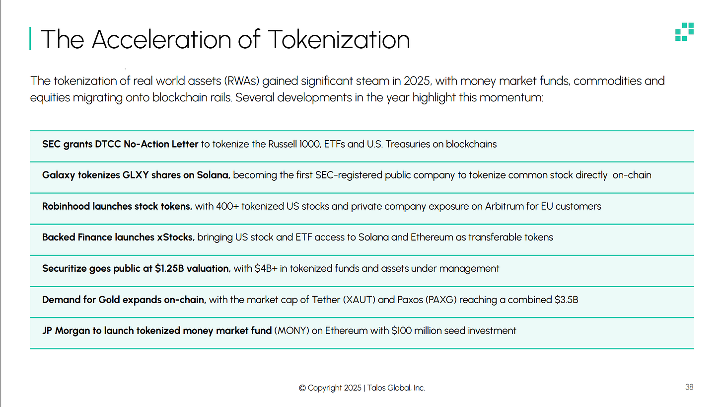 A migração de ativos para blockchains continua a se expandir, desde fundos do mercado monetário do JPMorgan, BlackRock e Franklin Templeton, títulos do Tesouro tokenizados como alternativas de geração de rendimento, commodities como o ouro, com valor de mercado de US$ 3,5 bilhões, e ações em múltiplas formas, desde emissões nativas até títulos perpétuos. Os alicerces da clareza regulatória, da maturidade tecnológica e da participação institucional estão começando a se consolidar, preparando o terreno para uma aceleração da tokenização em 2026.